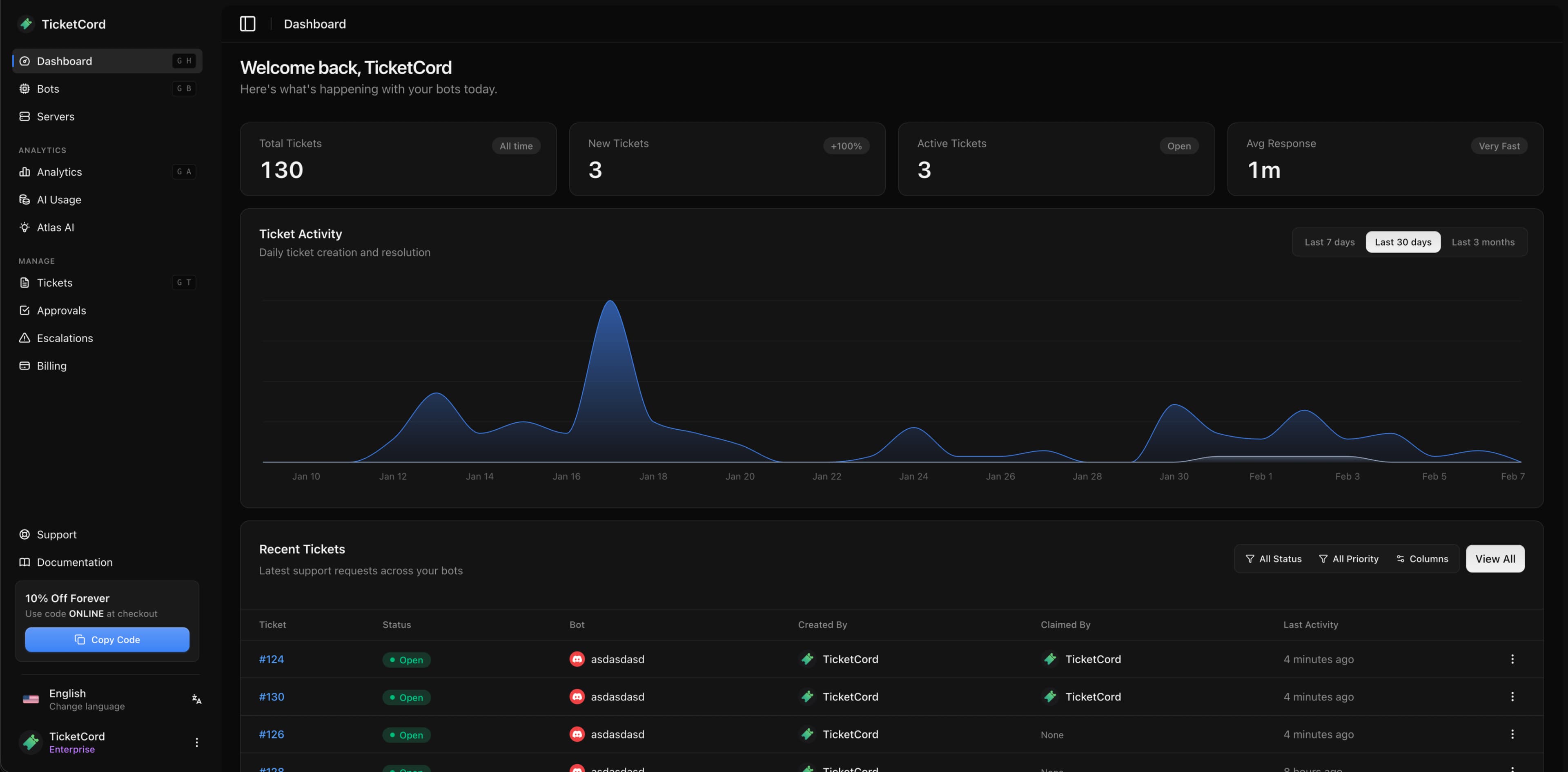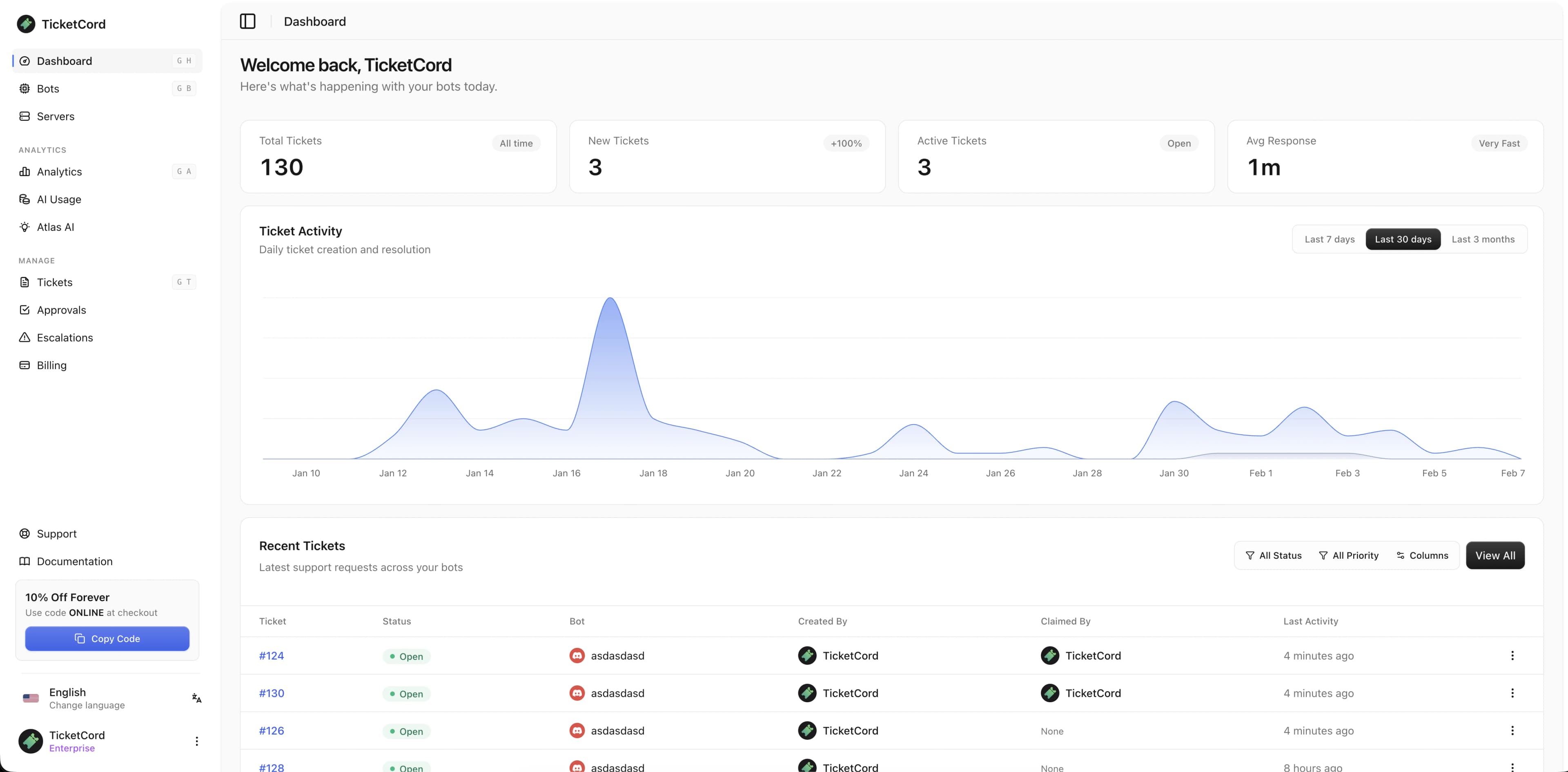 Sistema de soporte completo para servidores y miembros de Discord. Gestión de tickets de nivel empresarial con automatización IA diseñada para comunidades de todos los tamaños.